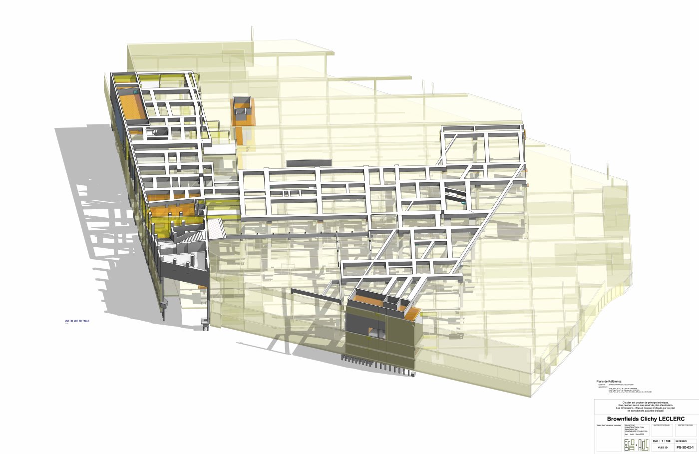 Construit en 1995, l’Espace Clichy fait partie de cette génération d’hypermarchés urbains intégrés dans le bâti. Il est situé en cœur d’un ilot, ceinturé par des immeubles de bureaux et de logements. Divisé en plusieurs volumes, il comprend l’hypermarché Leclerc, une galerie commerciale, 2 niveaux de parking, des bureaux et locaux du personnel. Le projet prévoit, au-dessus de cet ensemble, la réalisation de 273 logements neufs. Il s’appuie sur une démolition partielle de l’existant, puis sur la construction d’une « table d’assise » indépendante de la structure actuelle, capable de supporter 5 bâtiments en R+7.